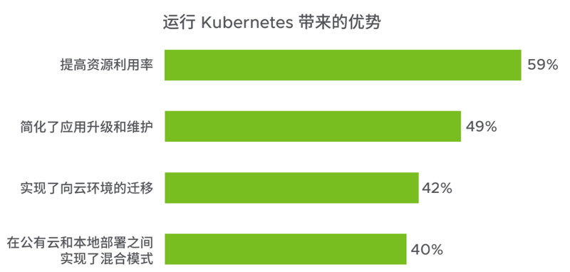 今年,99%的受访者表示,他们已经意识到部署 Kubernetes 带来的优势。排在 前两位的优势保持不变,依然是提高了资源利用率 (59%),以及简化了应用升级和维护 (49%)。实现了向云环境的迁移 (42%) 位居第三,接着是实现了混合云模式 (40%),这进一步强调了云的重要性。选择降低公有云成本 (34%) 的受访者比例也比去年增加了 6%。