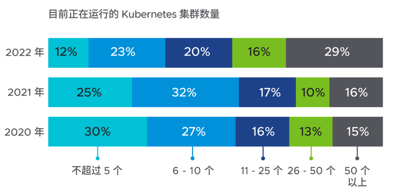 Kubernetes 正在成为主流技术的一个最明显迹象是要部署的集群数量出现快速增长。我们 2022 年的问卷调查显示,只有 12% 的公司拥有不超过 5 个集群,而 29% 的公司拥有 50 个以上的集群。