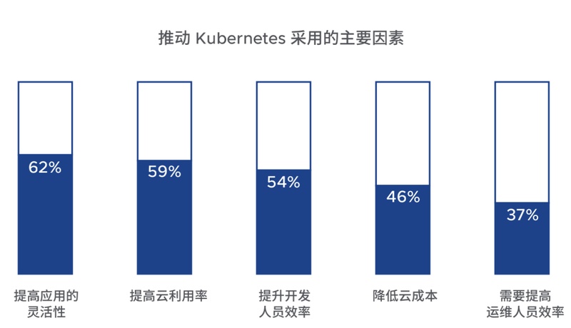 随着 Kubernetes 的快速增长,哪些因素最能推动公司采用 Kubernetes?改进软件开发位居榜首,62% 的受访者选择提高应用的灵活性,54% 选择提升开发人员效率。公司似乎很喜欢 Kubernetes 为他们带来的移动性。