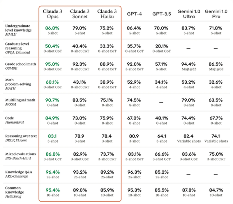 据悉,Claude 3一共有Haiku、Sonnet和Opus三个版本。根据其评测报告显示,Opus在研究生水平专家推理、基础数学、本科水平专家知识、代码等10个维度,超过OpenAI的GPT-4。