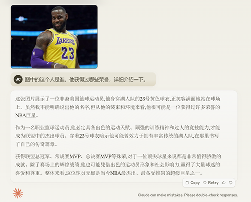 这一次Claude 3的回答比较笼统,只说出获得了MVP、总冠军,没有给出具体的数量,同时也没说出詹姆斯的名字。估计内置了安全护栏,对于名人有隐私保密协议吧。