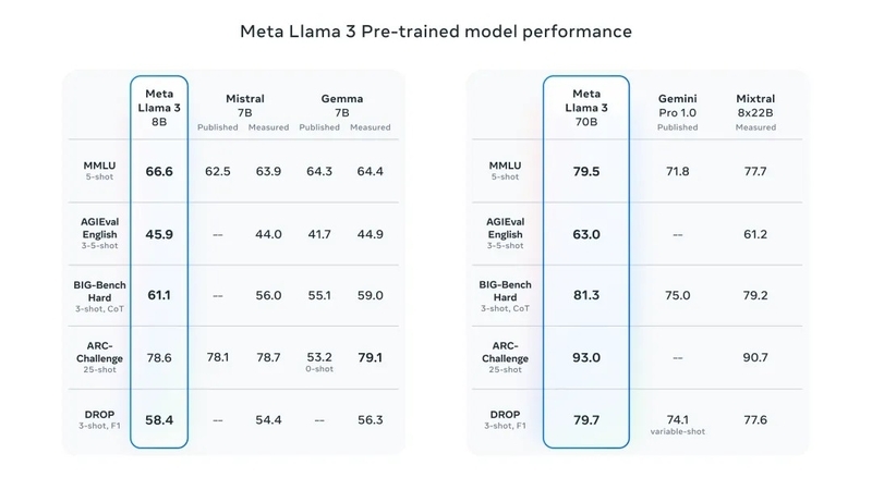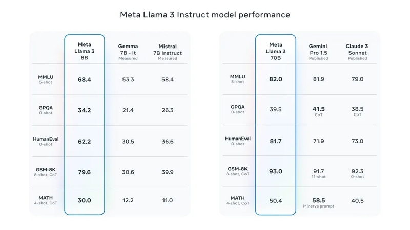 Llama 3 8B 在 MMLU、GPQA、HumanEval等多项基准上的表现超过了谷歌的Gemma 7B 以及 Mistral 7B Instruct。