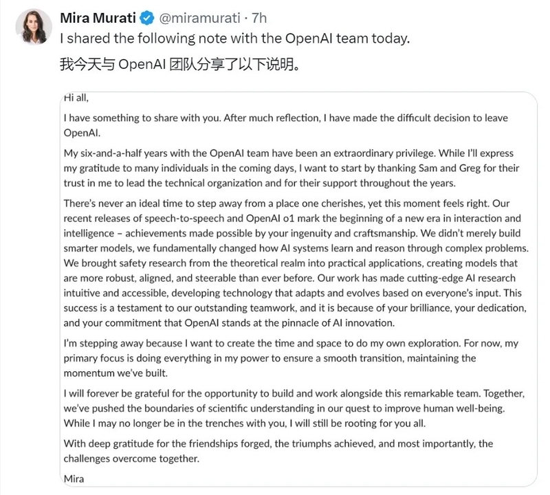 在她的离职信中,Murati深情回顾了与同事们的合作经历,并强调了团队在推动AI技术进步方面所做的努力和贡献。